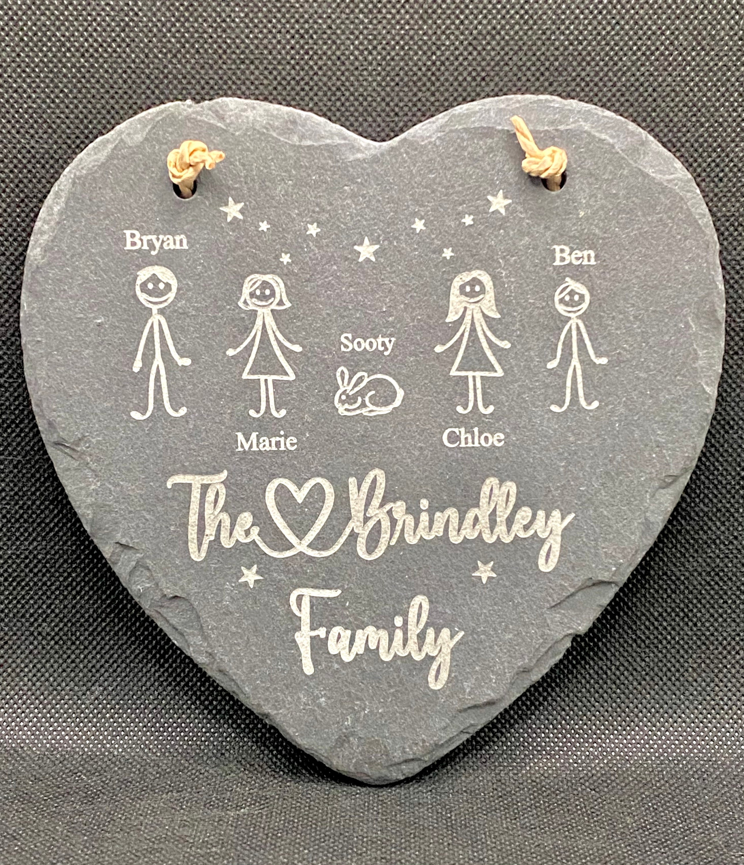 Designed and professionally laser engraved in the UK just for you, this beautiful slate heart would make a lovey keepsake for the whole Family. It can be personalised to your design and can include up to Eight Family members including Dogs, Horses and Cats.